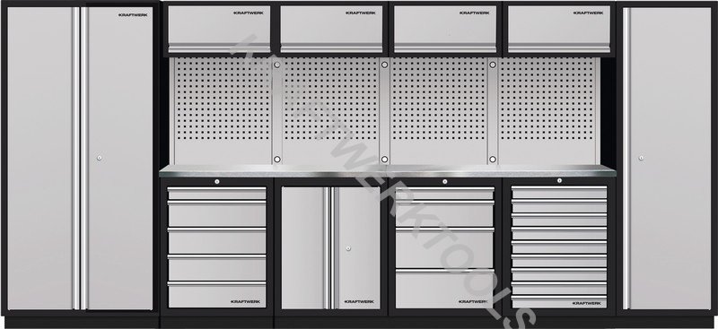 AKCE KW Dílenská stěna 4235x488x2000mm 18 zásuvek, 7 skříněk, deska NEREZ MOBILIO GREY dílenský nábytek